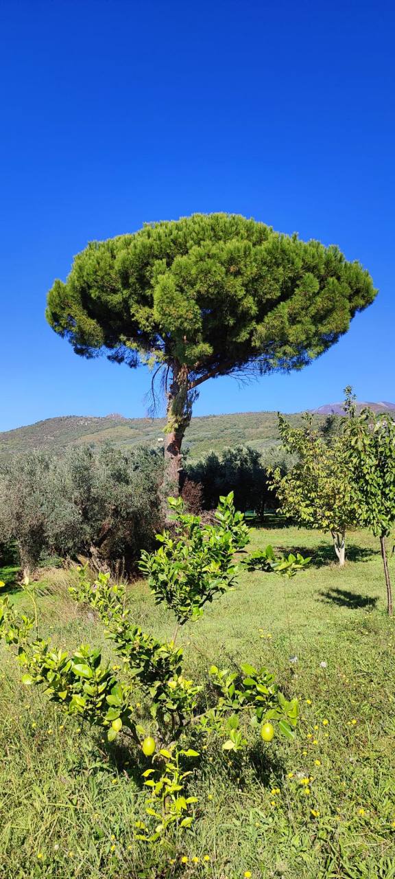 La proprietà si estende su un lotto generoso di oltre 4.000 mq, arricchito da rigogliose piante da frutto e un maestoso pino marino che regala ombra e quiete al giardino.